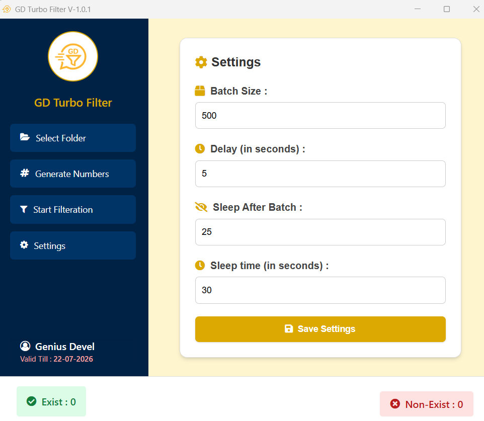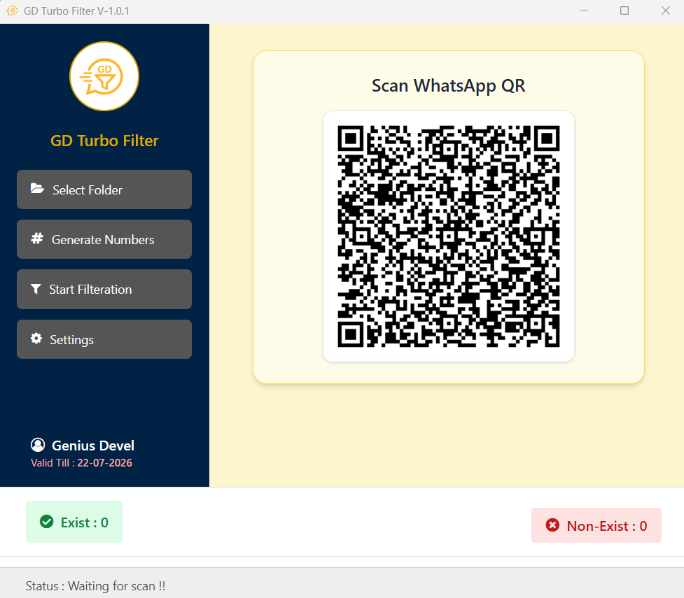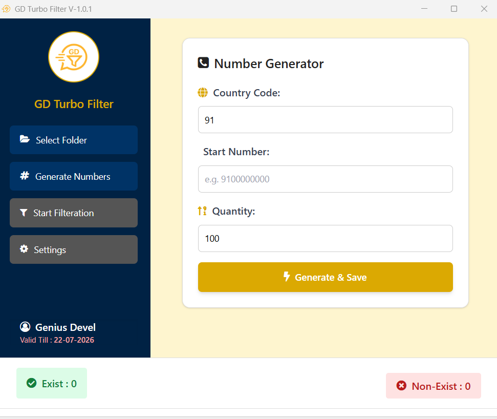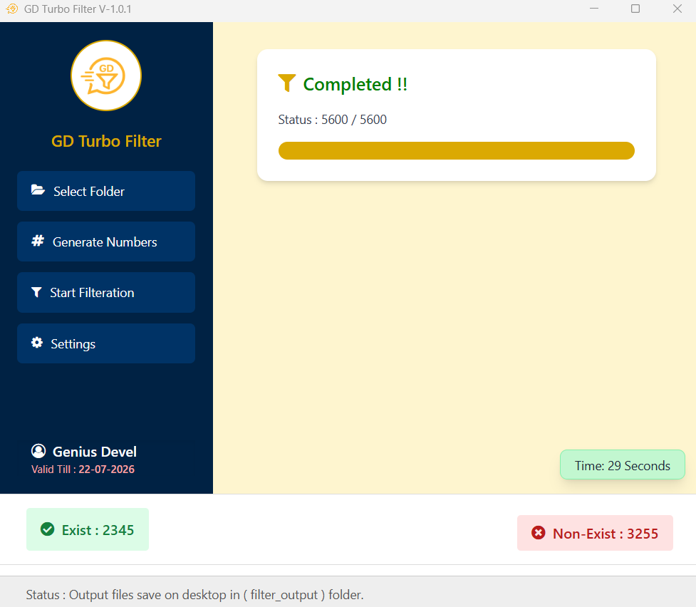 GD Turbo Filter – Fast and Reliable WhatsApp Number Filtering Software GD Turbo Filter is a high-performance desktop application designed to accurately and efficiently filter valid WhatsApp numbers from large lists of mobile numbers. With advanced batch processing logic, it can scan and verify thousands of numbers per minute while maintaining safety and avoiding bans. You can filter 10k - 25k numbers in just 2 mins its depend on your GD Turbo filter program configuration Key Features: High-speed WhatsApp number filtering with support for up to 10,000 numbers per minute. Secure license-based activation system with online license key verification. Easy WhatsApp login using QR code through official WhatsApp Web. Folder-based processing: Select a folder containing Customizable punch size and delay settings for safe and optimized batch filtering. Real-time progress display with filtering count updates. Start, pause, and stop filtering with a single click. Built-in settings management to save and reuse filtering preferences. No external setup required; runs directly as a packaged GD Turbo Filter is ideal for marketers, lead generation teams, and professionals who need fast and accurate WhatsApp number verification. Note : For avoiding ban 01- Filter maximum 50k numbers using a whatsapp account in a day. 02- Set Batch size- 50, delay - 0.5, Rest after batch - 30, Rest time - 25 sec.
