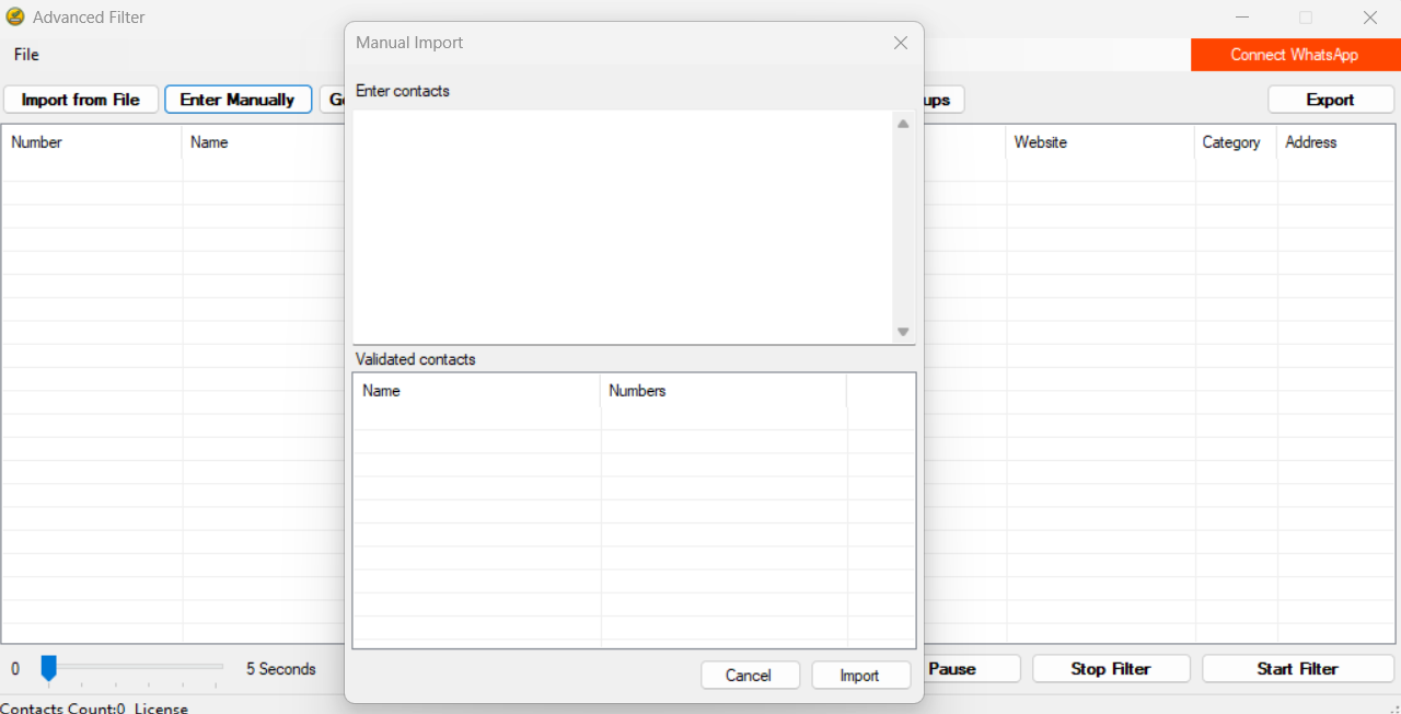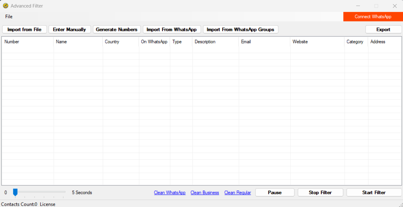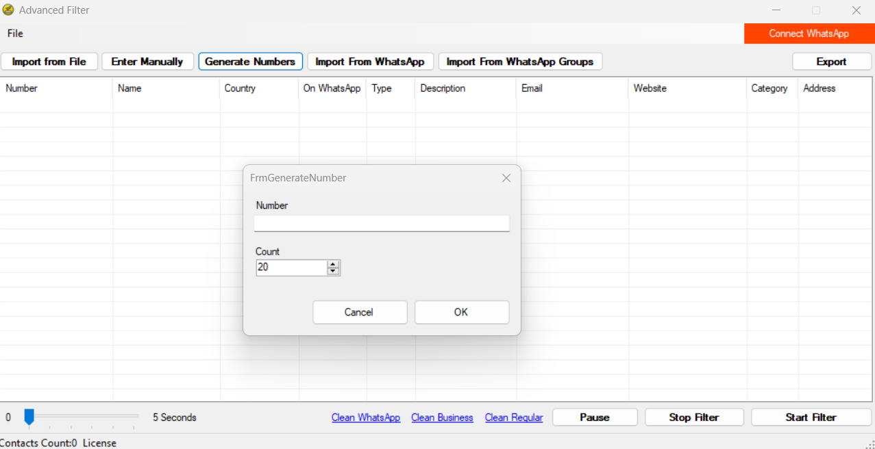 This tool developed for filter bulk number for know that which number are active on whatsapp and which are not active on whatsapp by using this tool you can easily filter none whtsapp number in just some time.